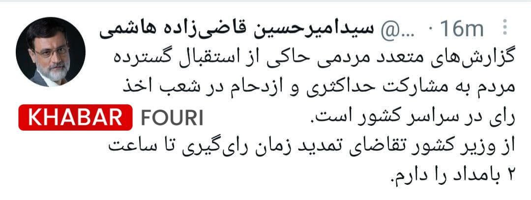 رضایی، قاضی زاده هاشمی، رئیسی و همتی از وزارت کشور خواستند زمان رای گیری انتخابات ریاست جمهوری تا ساعت ۲ بامداد تمدید شود.