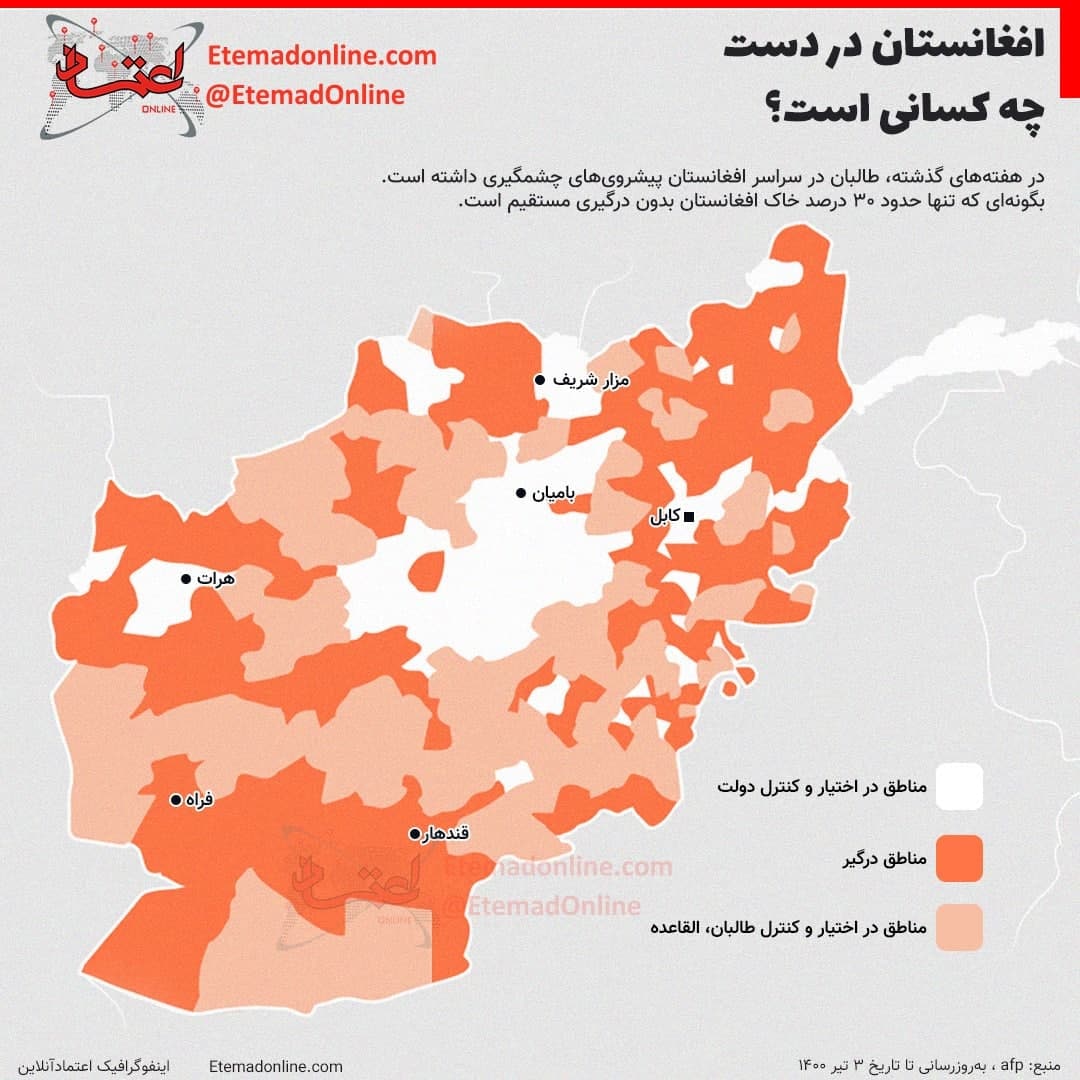 افغانستان به صورت عجیبی در خطر است. نمودار زیر نشان می دهد که اکثر مناطق افغانستان یا درگیر جنگ است و یا در تصرف نیروهای طالبان.
