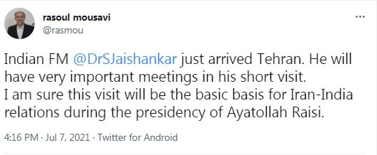 در همین خصوص نیز «سید رسول موسوی» دستیار وزیر امور خارجه و مدیرکل آسیای جنوبی وزارت امور خارجه در توئیتی با اشاره به ورود وزیر خارجه هند به تهران نوشت: وزیر خارجه هند ملاقات خیلی مهمی در این دیدار کوتاه خواهد داشت. مطمئن هستم که این دیدار پایهای اساسی برای روابط ایران و هند در دوران ریاست جمهوری آیتالله رئیسی خواهد بود.