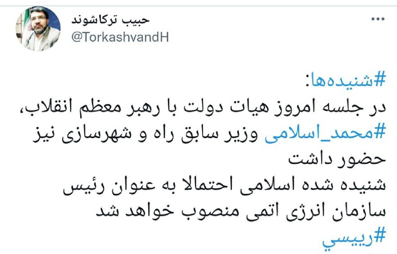 یک خبرنگار اصولگرا در توییتی، با اشاره به حضور محمد اسلامی در دیدار امروز کابینه دولت سیزدهم با رهبر انقلاب، احتمال داده وزیر راه و شهرسازی روحانی، رییس سازمان انرژی اتمی و معاون ابراهیم رئیسی شود.