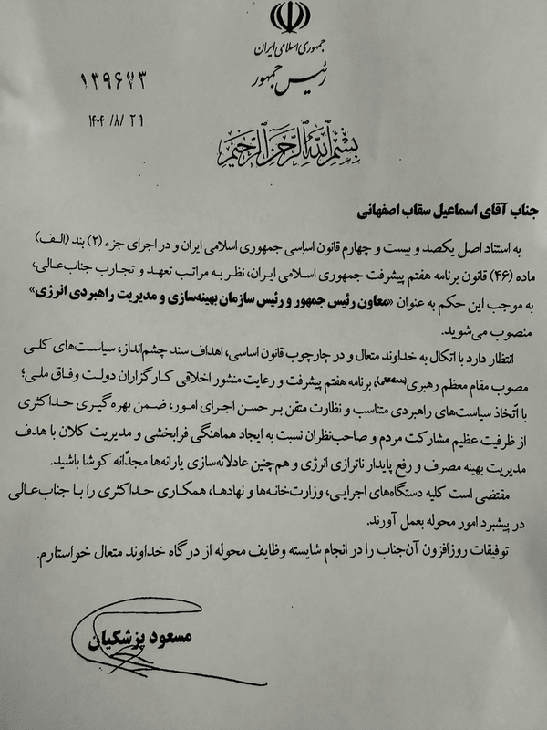 در اقدامی مبتنی بر بهرهگیری از ظرفیتهای جوان و متخصص در مدیریت کلان کشور، «اسماعیل سقاب اصفهانی» با حکم رئیس جمهور، به سمت معاونت رئیس جمهور و رئیس سازمان ملی بهینه سازی ایران منصوب شد.این تصمیم، علاوه بر جنبههای مدیریتی، در راستای اجرای ماده ۴۶ قانون برنامه هفتم توسعه نیز انجام شده است. بر اساس این ماده قانونی، دولت مکلف است به منظور ارتقای بهرهوری و استفاده بهینه از منابع، ظرفیتهای سازمان ملی بهینه سازی ایران را تقویت کند.ماموریت اصلی سازمان تحت رهبری جدید، تمرکز بر بهینهسازی مصرف انرژی و مدیریت راهبردی این حوزه حیاتی خواهد بود.