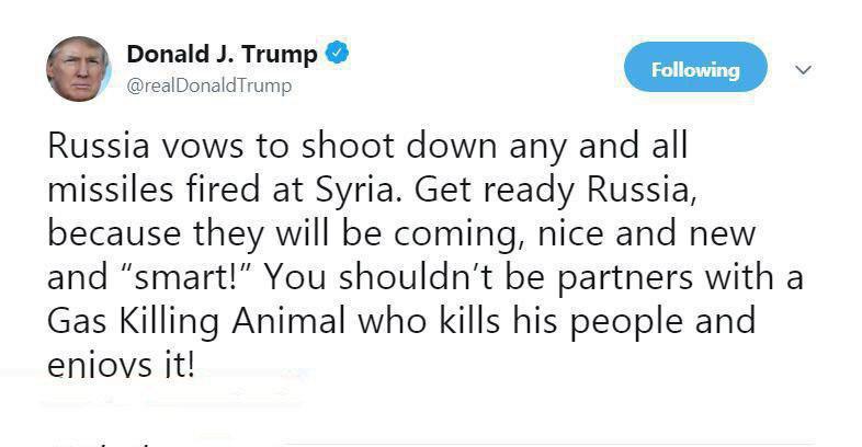 ترامپ در توییتی نوشت: روسیه گفته هر موشکی را که به سمت سوریه شلیک شود ساقط میکند. پس آماده باش روسیه، چون موشکهای زیبا، جدید و هوشمند ما دارد میآید.