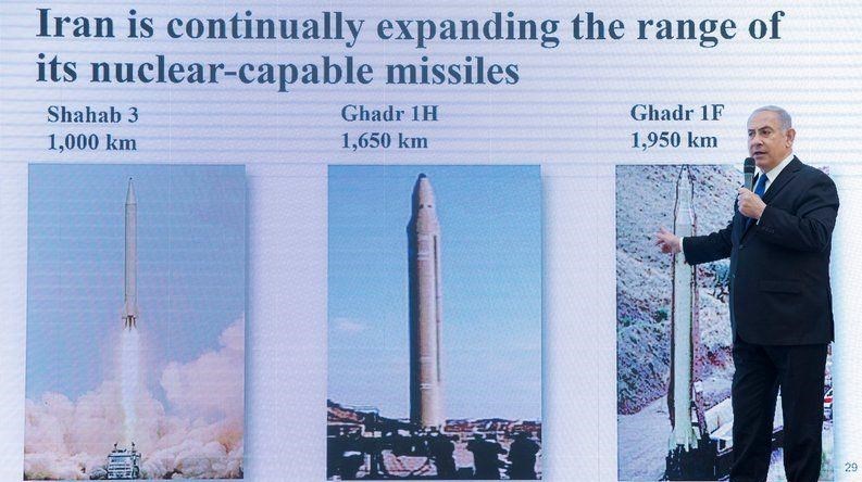 نتانیاهو دربخشی از نمایش رسانه‌ای خودش، تصویر چند فروند از موشک‌های بالستیک ساخت ایران را به نمایش گذاشته وسپس بدون ارائه هرگونه سند معتبری، ادعاهایی بی اساس را علیه توان موشکی کشورمان مطرح می کند.