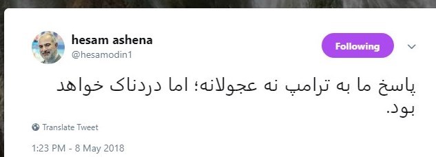 حسامالدین آشنا مشاور فرهنگی رئیسجمهور در صفحه شخصی خود در واکنش به خروج آمریکا از برجام نوشت: پاسخ ما به ترامپ نه عجولانه؛ اما دردناک خواهد بود.