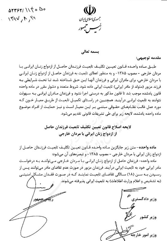 لایحه "اصلاح قانون تعیین تکلیف تابعیت فرزندان حاصل از ازدواج زنان ایرانی با مردان خارجی" که بهپیشنهاد وزارت تعاون، کار و رفاه اجتماعی در جلسه مورخ 1397/08/13 هیأت وزیران بهتصویب رسیده است، جهت طی تشریفات قانونی به مجلس شورای اسلامی ارسال شد.
