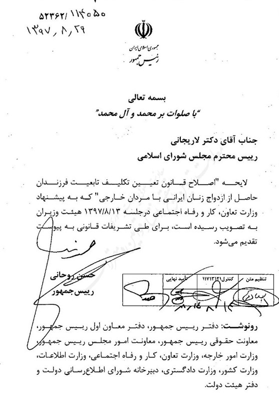 روحانی لایحه اصلاح قانون تعیین تکلیف تابعیت فرزندان را به مجلس فرستاد + عکس