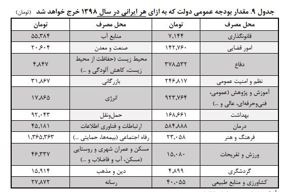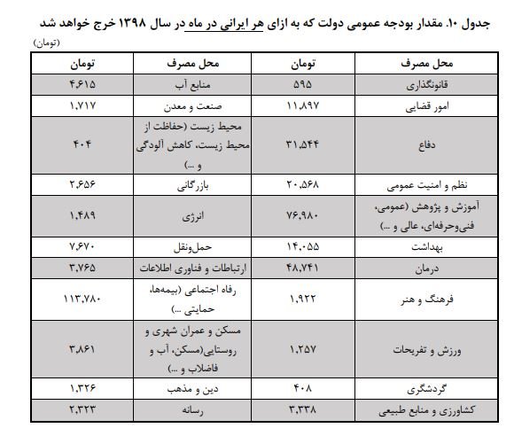 جدول شماره دو نیز میزان بودجه عمومی دولت که به ازای هر ایرانی در ماه ۱۳۹۸ خرج می شود را در بردارد.