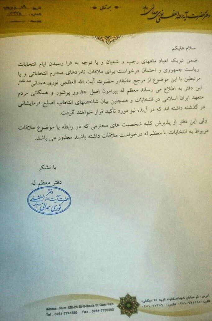 ضمن تبریک اعیاد ماههای رجب و شعبان و با توجه به فرارسیدن ایام انتخابات ریاست جمهوری و احتمال درخواست برای ملاقات نامزدهای محترم انتخاباتی و یا مرتبطین با این موضوع از مرجع عالیقدر حضرت آیتاللهالعظمی حسین نوری همدانی مد ظله العالی، این دفتر به اطلاع میرساند معظمله پیرامون اصل حضور پرشور و همگانی مردم متعهد ایران اسلامی در انتخابات و همچنین بیان شاخصهای انتخاب اصلح، فرمایشاتی در گذشته داشتهاند که در آینده نیز مورد تأکید هستند.