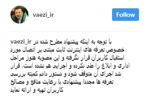 وزیر ارتباطات و فناوری اطلاعات در اینستاگرام خود با توجه به اعتراض کاربران به تعرفه های جدید اینترنت ثابت، خبر از توقف اجرای پیشنهاد مطرح شده داد.