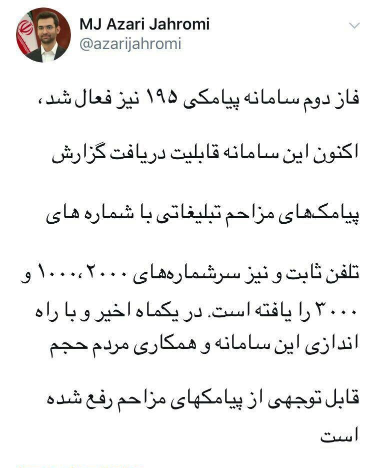 وزیر ارتباطات از فعال شدن فاز دوم سامانه پیامکی ۱۹۵ به منظور دریافت گزارش پیامکهای مزاحم خبر داد.