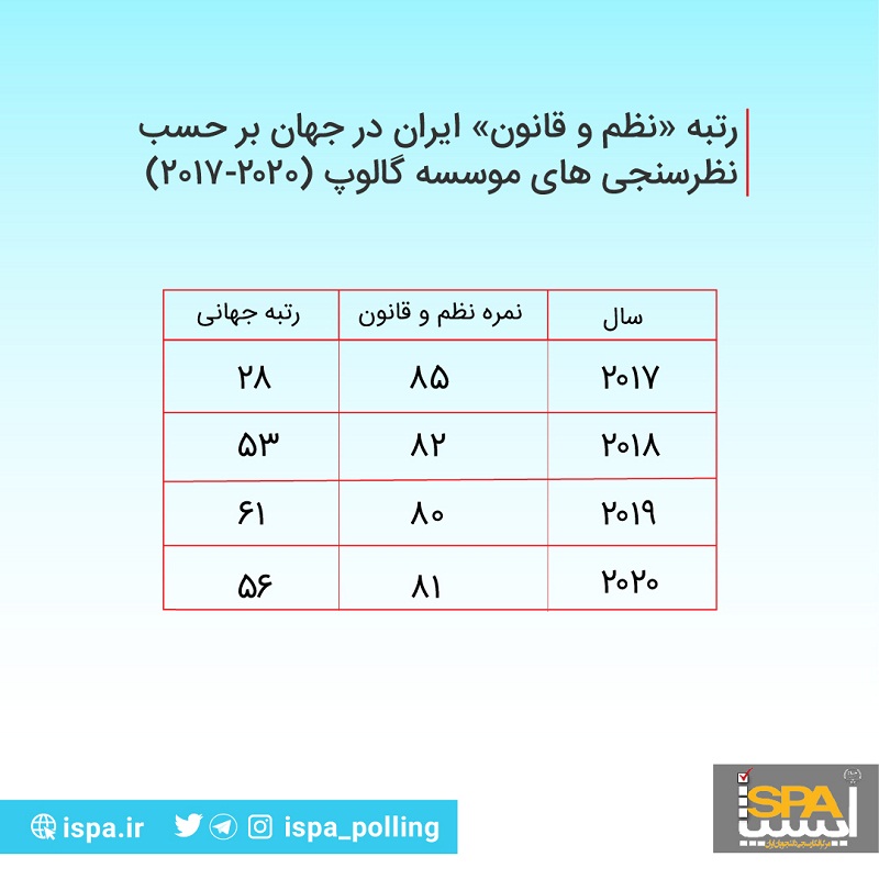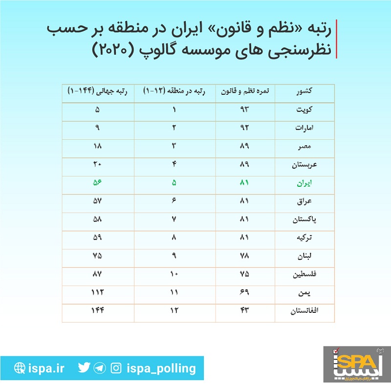 شاخص نظم و قانون موسسه نظرسنجی گالوپ (2020)؛ ایران از بین 144 کشور، در جایگاه 56 قرار دارد