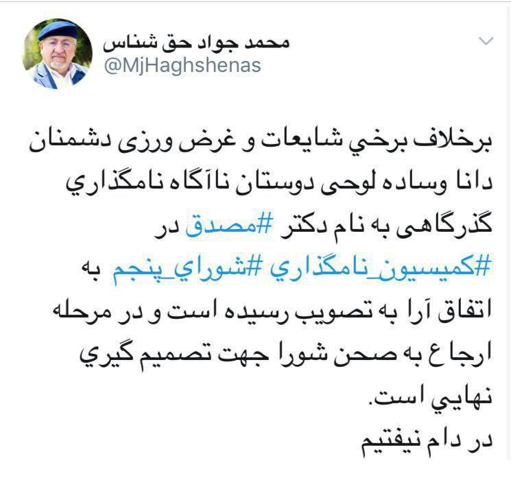 عضو شورای شهر تهران که به انتشار خبري در خصوص عدم نامگذاري خياباني به نام مصدق واکنش نشان داده بود در توییتر خود از نامگذاری گذرگاهی به نام دکتر مصدق خبر داد.