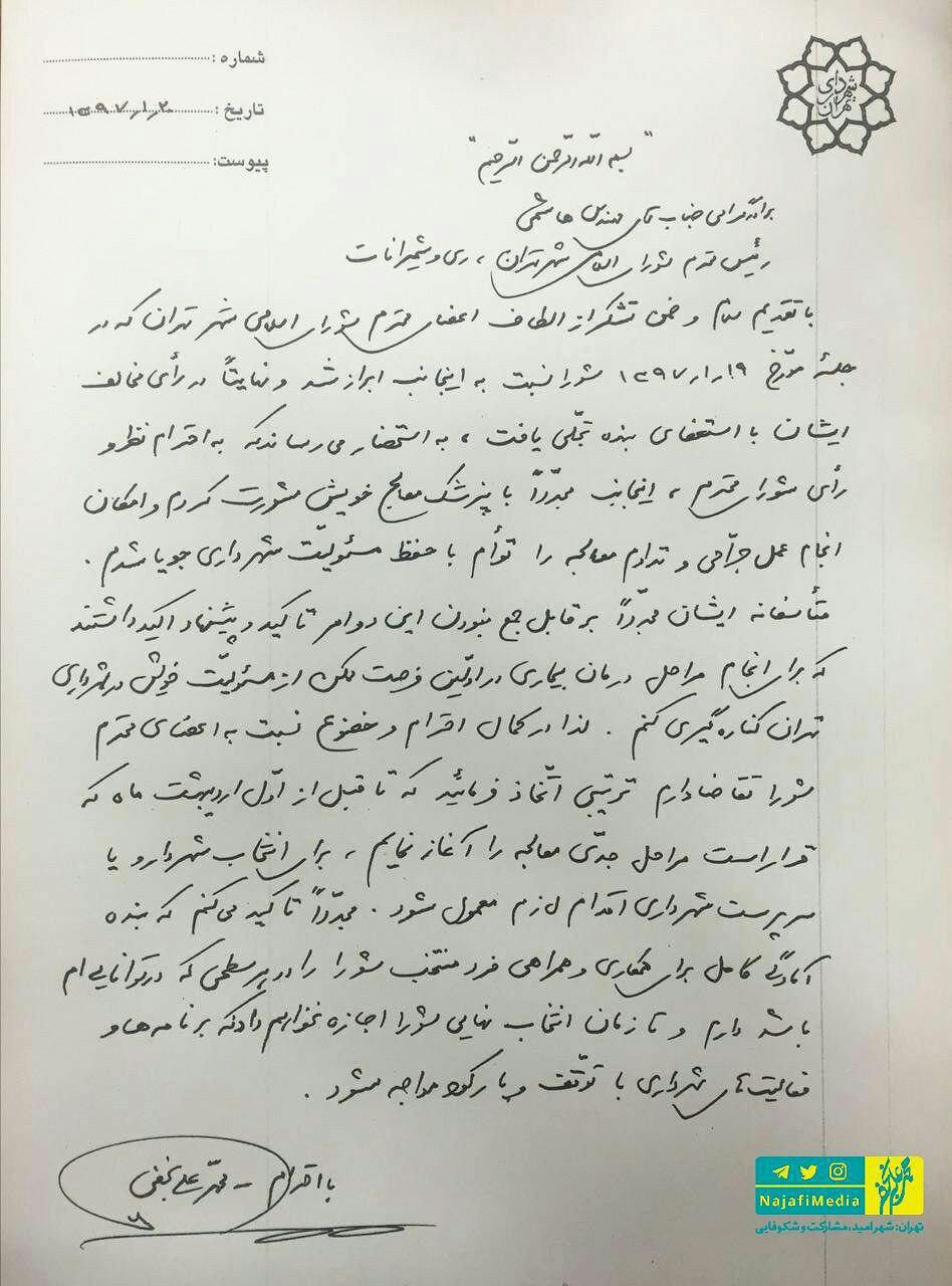 محمد علی نجفی شهردار تهران برای بار دوم استعفا داد. متن دومین استعفای نجفی، شهردار تهران را ببینید.