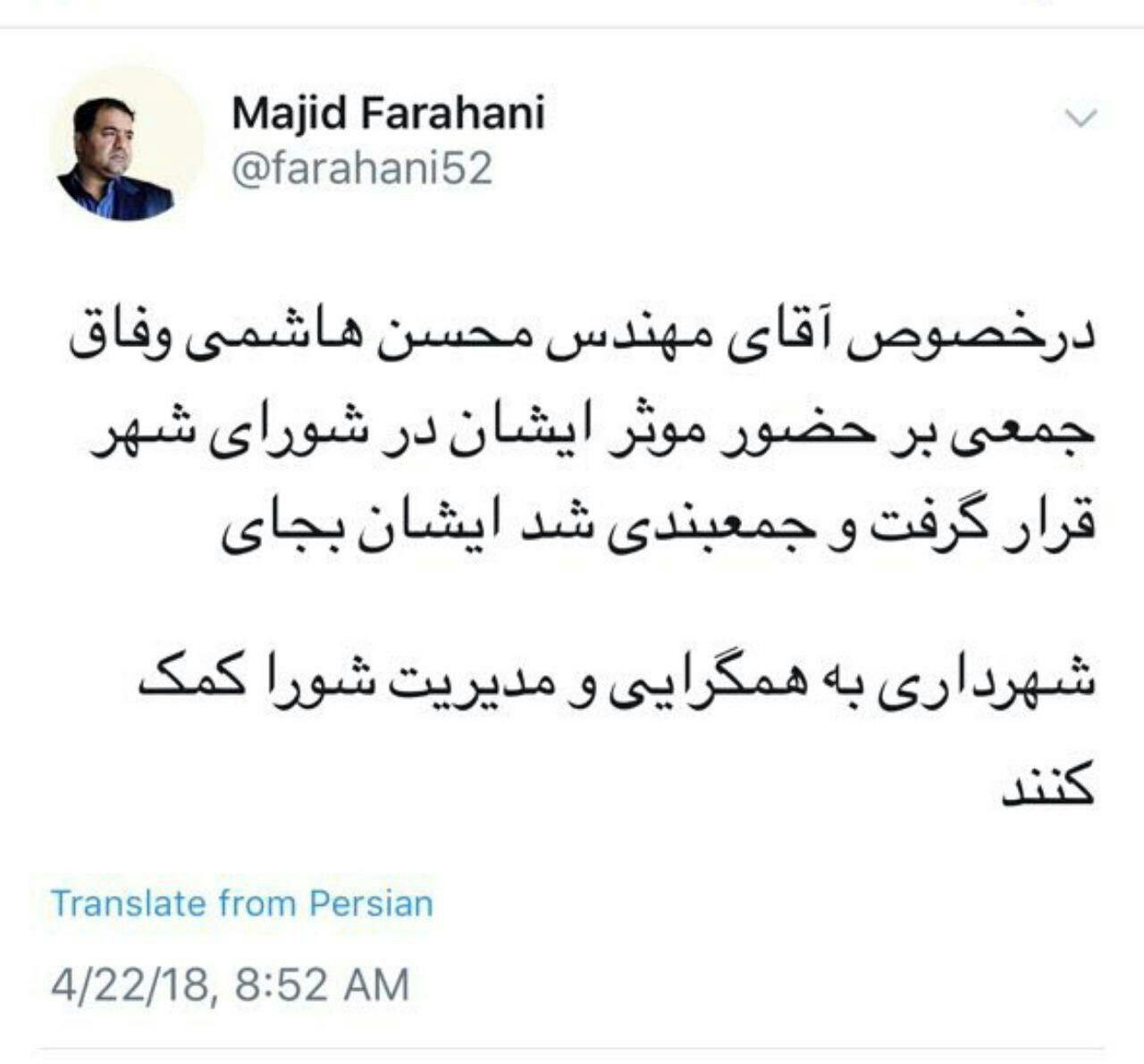 فراهانی، عضو شورای شهر در توییتی از تصمیم جمعی درباره حضور محسن هاشمی در شورای شهر خبرداد.