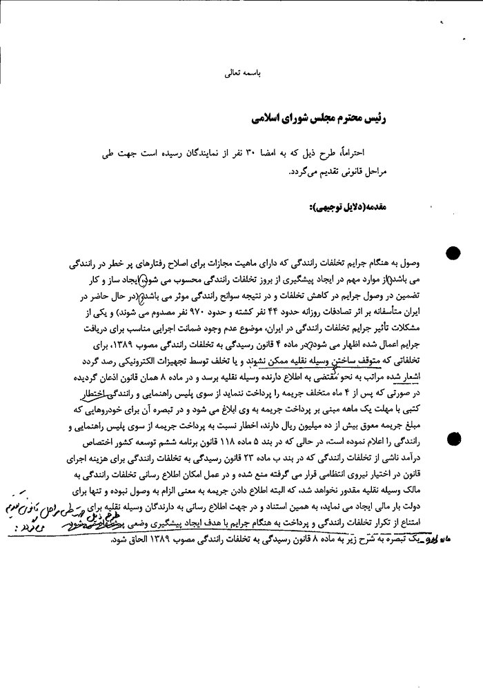به تازگی طرح الحاق یک تبصره به ماده ۸ قانون رسیدگی به تخلفات رانندگی مصوب سال ۸۹ در مجلس شورای اسلامی اعلام وصول شده است.