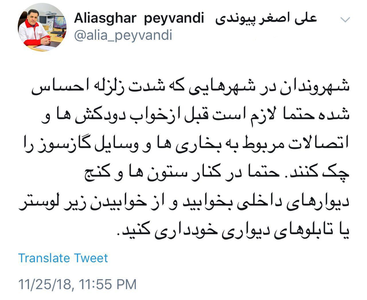 رییس جمعیت هلال احمر به شهروندان در شهرهایی که شدت زلزله امشب کرمانشاه احساس شده برای استراحت در مکان های امن توصیه هایی داشت.