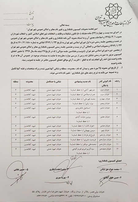 اعضای شورای شهر تهران در بررسی تغییر نام معابر و اماکن عمومی شهر تهران، سه شنبه ۲۷ فروردین ماه پیشنهاد دادند که خیابان «سپند» در منطقه یک به نام «عزتالله انتظامی»، بلوار فلامک جنوبی و شمالی در منطقه ۲ به نام «محمدرضا شجریان»، خیابان کوکب در منطقه ۲ به نام «غلامحسین امیرخانی» (خوشنویس)، خیابان نیلوفر در منطقه ۲ به نام «علی نصیریان»، خیابان معارف به نام «داود رشیدی» و ۲۴ متری سعادت آباد به نام «محمد علی کشاورز» نامگذاری شود.