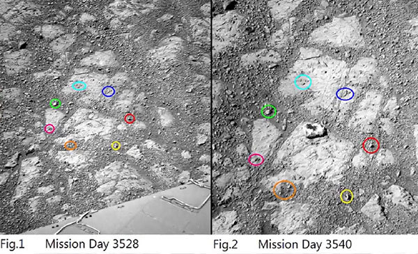 ناسا هر چند وقت یکبار عکسهایی از سیاره مریخ برای مطالعه توسط دانشمندان و دوستداران فضا منتشر میکند. همان طور که در تصویر بالا مشاهده میکنید، عکس اول در روز ۳۵۲۸ و عکس دوم در روز ۳۵۴۰ ماموریت مریخ نورد، فقط ۱۲ روز پس از عکس اول گرفته شده است. در تصویر دوم میتوانید سنگ بزرگی را ببینید که در تصویر اول وجود ندارد. ناسا توضیحی برای اینکه این سنگ از کجا آمده است ندارد.