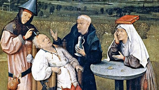 سوراخ کردن جمجمه، شاید یکی از ابتداییترین روشهای درمان بیماریهای روانی و مغزی بوده است. در این روش درمانی به وسیله یک مته، چاقو و یا حتی اره سوراخی در جمجمه ایجاد و یا قسمتی از آن برداشته میشود. طبق برخی ارزیابیها این روش درمانی قدمتی بیش از ۷ هزار سال دارد. در این روش درمانی با حذف قسمتی از جمجمه، هدف در کاهش سردردها، بیماریهای روانی و حتی خروج فرد از تصرف شیطان داشته اند!