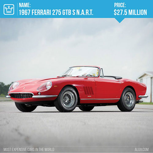 در این قسمت به نیمه راه فهرست گرانترین خودروهای دنیا رسیدیم و یک بار دیگر شاهد حضور نام فراری هستیم. این خودرو نیز سفارشی و به تعداد محدود ساخته شده و به همین دلیل نیز قیمت آن هر سال افزایش پیدا میکند. داستان ساخت این خودرو نیز در نوع خود جالب توجه به نظر میرسد و اگر نگاهی به نام فراری ۲۷۵ جی. تی. بی اس. ان. آ. ار. تی اسپایدر (Ferrari ۲۷۵ GTB/۴*S N.A.R.T. Spider) داشته باشید متوجه عبارت اختصاری N.A.R.T خواهید شد این اختصار بهمعنای تیم مسابقه آمریکای شمالی (North American Racing Team) است و از خودرویی صحبت میکنیم که انحصارا توسط لوییجی چینِتی (Luigi Chinetti) به فراری سفارش داده شد.