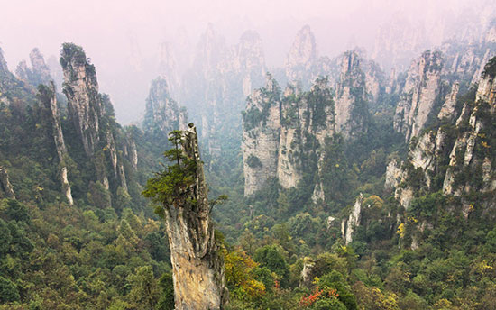 این کوهستان که در شمال منطقهی هونان چین یافت میشود، شامل سنگهای آهکی بسیار زیادی است که با گیاههای متجمع و مه پوشیده شده اند. ماشینهای کابلی میتوانند شما را از فراز آن رد کنند. البته انتخاب بهتر این است که با قطارهای متفاوت، از میان این مکان رازآلود گذر کنید و لذت ببرید. این منطقه یکی از صحنههای فیلمبرداری، فیلم معروف آواتار است.