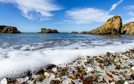 دریای درخشانی از شیشه در کالیفرنیا که با تلاشهای بسیاری از شرکتها و افراد نادان، در سال ۱۹۶۰ پر از محفطه و بطریهای شیشهای شد. اما جالب این است که دریا تمام این شیشهها را با به هم کوباندنشان، تبدیل به خرده ریزهای شیشهای کرد و بدین صورت، ساحل شیشهای پدید آمد. جالب اینجاست که امروزه، مردم با برداشتن شیشهها و بردنشان برای یادگاری، این جاذبهی گردشگری را خراب میکنند!