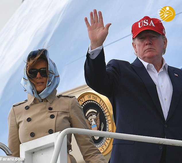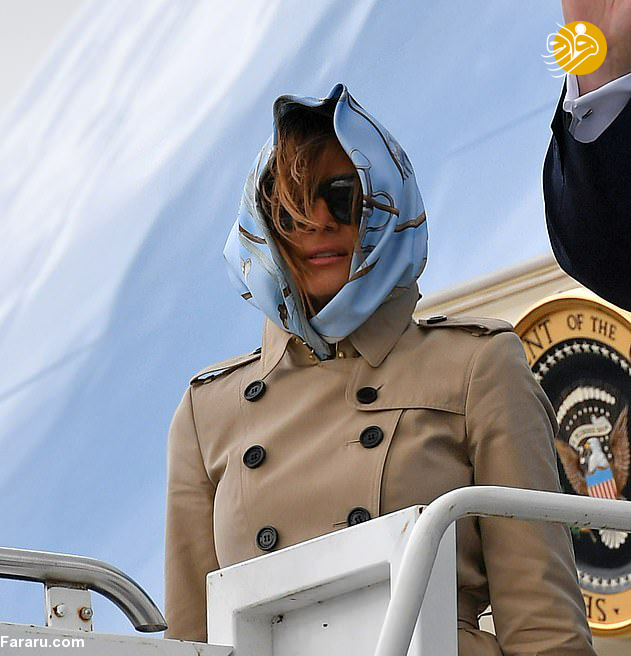 برخلاف همیشه ملانیا 49 ساله هنگام خروج از هواپیما او یک روسری به سر کرده بود. ترامپ نیز کراوات نزده بود.