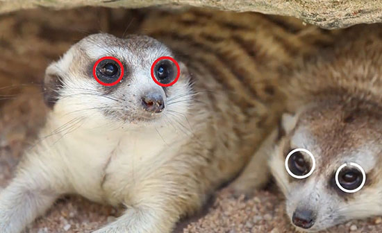 میرکتها سایهای تیره را در اطراف چشمهای خود دارند که همانند عینکهای آفتابی عمل میکنند. این پشمهای سیاه، تابش مستقیم اشعههای خورشید را بلاک میکند و در نتیجه میرکتها میتوانند به طور مستقیم بدون اینکه چشمهای آنها اذیت شود به خورشید نگاه کنند. این ویژگی باعث میشود تا میرکتها بتوانند به راحتی آسمان را نگاه کنند و از وجود پرندههای شکارچی به راحتی آگاه شوند و بقیه گروه را از وجود خطر آگاه کنند.
