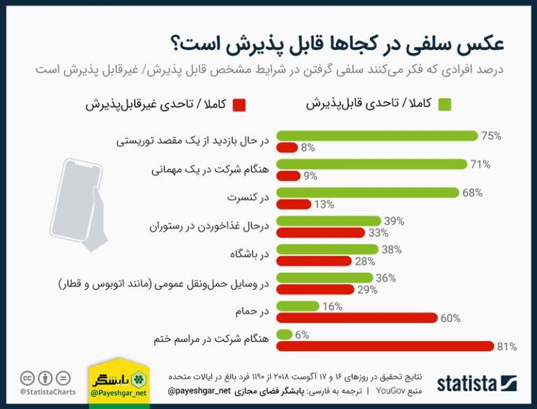 این درحالی است که حین غذا خوردن در رستوران، در باشگاه و حین استفاده از وسایل حملونقل عمومی درصد قابلقبول بودن عکاسی سلفی برتری چندانی بر درصد غیرقابل قبول بودن ندارد. از این آمار شاید بتوان اینطور استنباط کرد که سلفی گرفتن در چنین شرایطی باعث برانگیختن حس ناراحتی در سایرین خواهد شد و به همین دلیل، شاید بهتر باشد در این مکانها تا حد امکان از انداختن عکس سلفی خودداری کرد.
