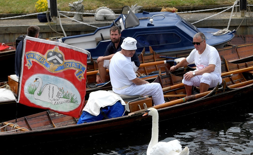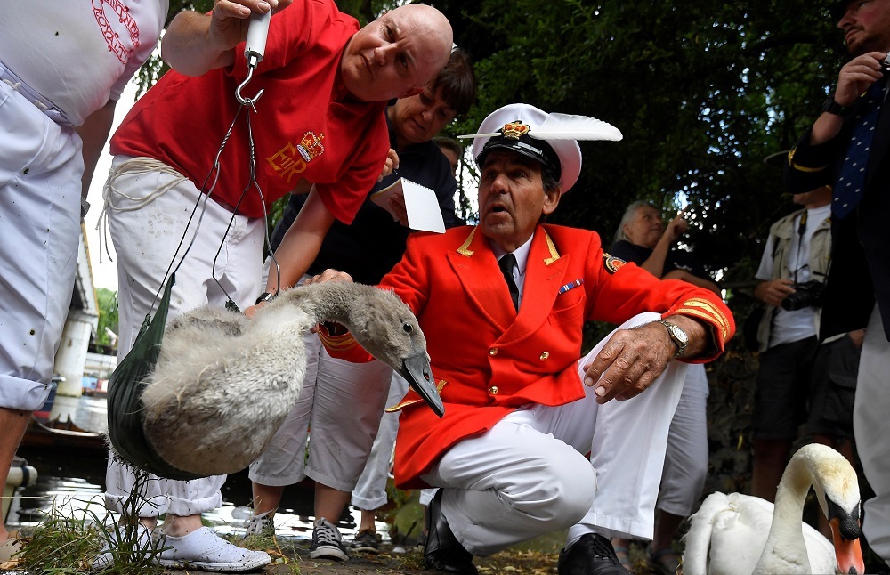 یک گروه با لباسهای همسان قرمز رنگ، روی قایقهای قدیمی در رودخانه تیمز به حرکت درآمدند. شمارش و علامتگذاری قوها، هر سال یک بار و در پنج روز انجام میشود.