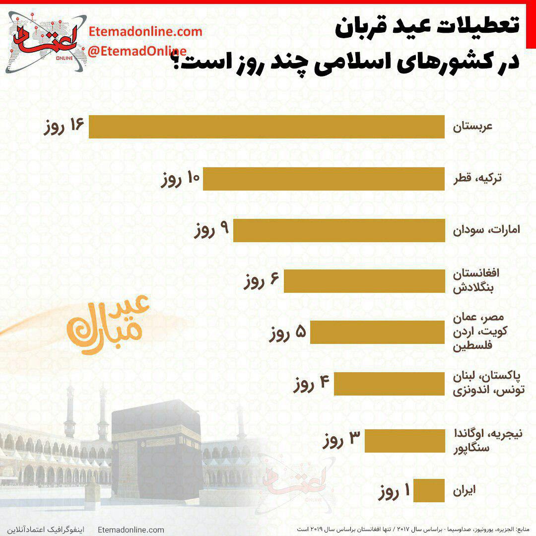 تعطیلات عید قربان در کشورهای مسلمان از ۱۶ روز در عربستان سعودی تا ۱ روز در ایران متفاوت است.