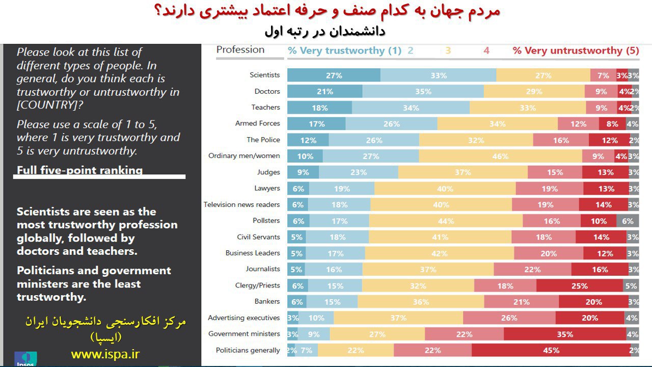 دانشمندان با ۶۰ درصد، بیشترین میزان اعتماد و افراد سیاسی با ۹ درصد، کمترین میزان اعتماد مردم را به خود اختصاص داده‌اند.