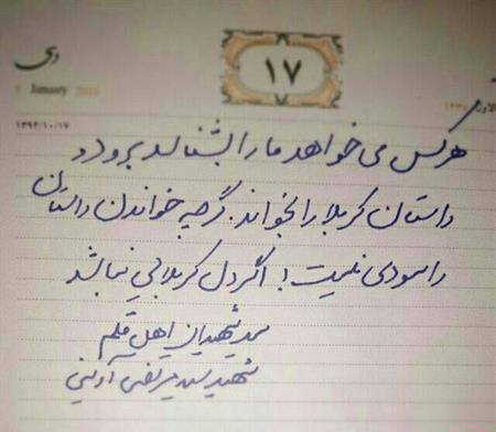 روی این عکس نوشته شده بود: "هرکس می خواهد ما را بشناسد برود و داستان کربلا را بخواند. گرچه خواندن داستان را سودی نیست! اگر دل کربلایی نباشد."