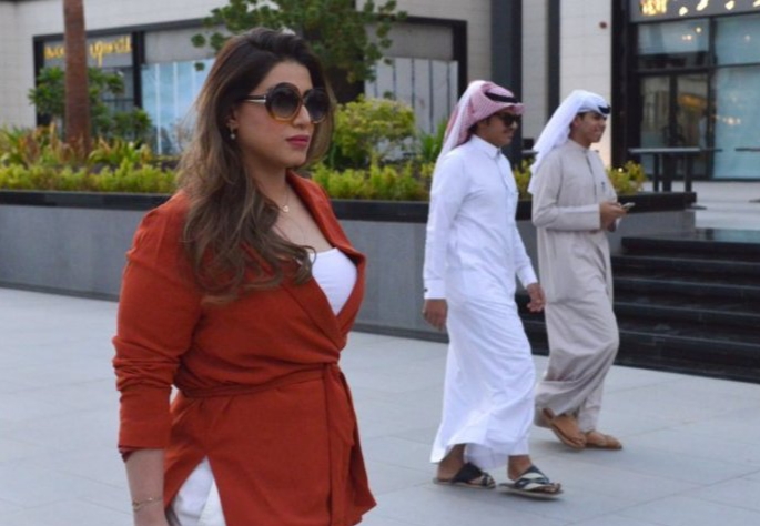 یک زن عربستانی پوشیدن چادر عربی را کنار گذاشته و با کفشهای پاشنه بلند و پیراهنی به رنگ نارنجی تیره و یک شلوار گشاد به مرکز ریاض رفته است.