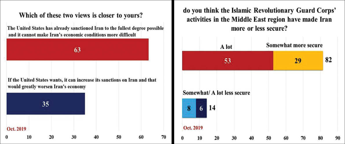 درخصوص نقش تحریمهای اخیر آمریکا بر اقتصاد ایران هم 48درصد معتقدند تأثیر منفی زیادی داشته و 32 درصد هم معتقد بوده اند که تأثیر منفی داشته است. با این حال تعداد کسانی که سوء مدیریت اقتصادی و فساد داخلی را مقصر وضعیت اقتصادی کشور می دانند 55درصد و کسانی که تحریم ها و فشارهای خارجی را مقصر می دانند 38درصد است.
