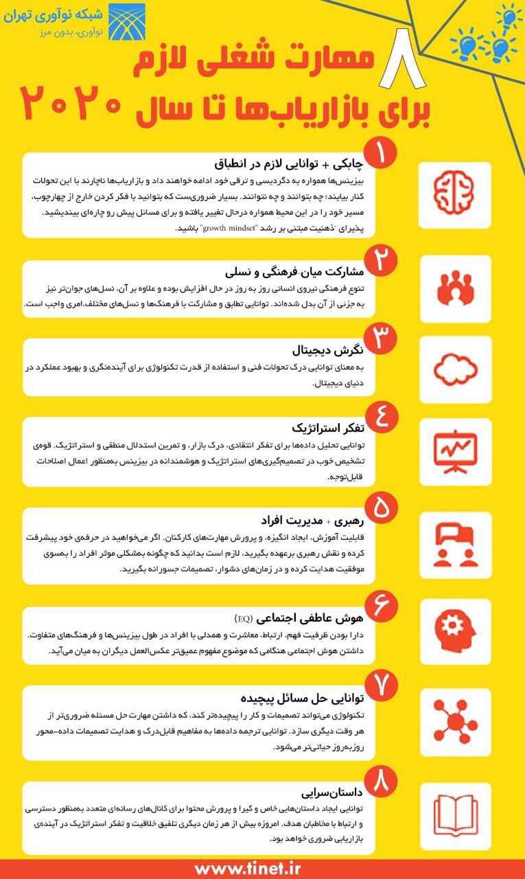 ۸ مهارت شغلی لازم برای بازاریابها تا سال ۲۰۲۰ را در این اینفوگرافیک بخوانید.