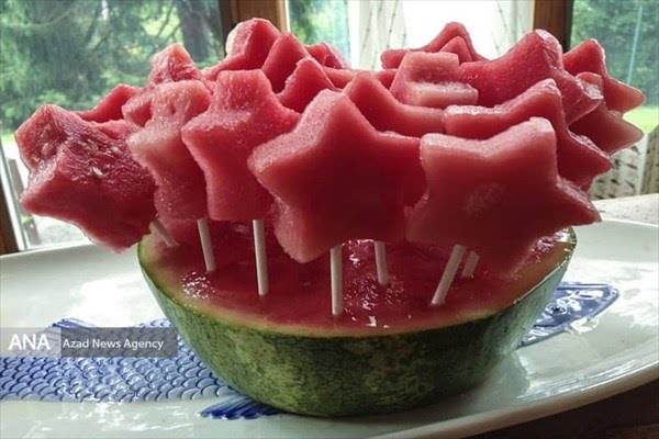 یکی از روش های ساده تزیین هندوانه شب یلدا این است که هندوانه را به دو بخش تقسیم کنید و با استفاده از قالب مخصوص، هندوانه ها را به شکل قالب در آورید و هر کدام را بر سر چوب مخصوص قرار دهید. پس از آن کافی است که چوب ها را داخل هندوانه خود بگذارید. به این ترتیب علاوه بر این که خوردن هندوانه را برای سایرین بسیار راحت تر کرده اید، تزیین متفاوت تری نیز خواهید داشت.