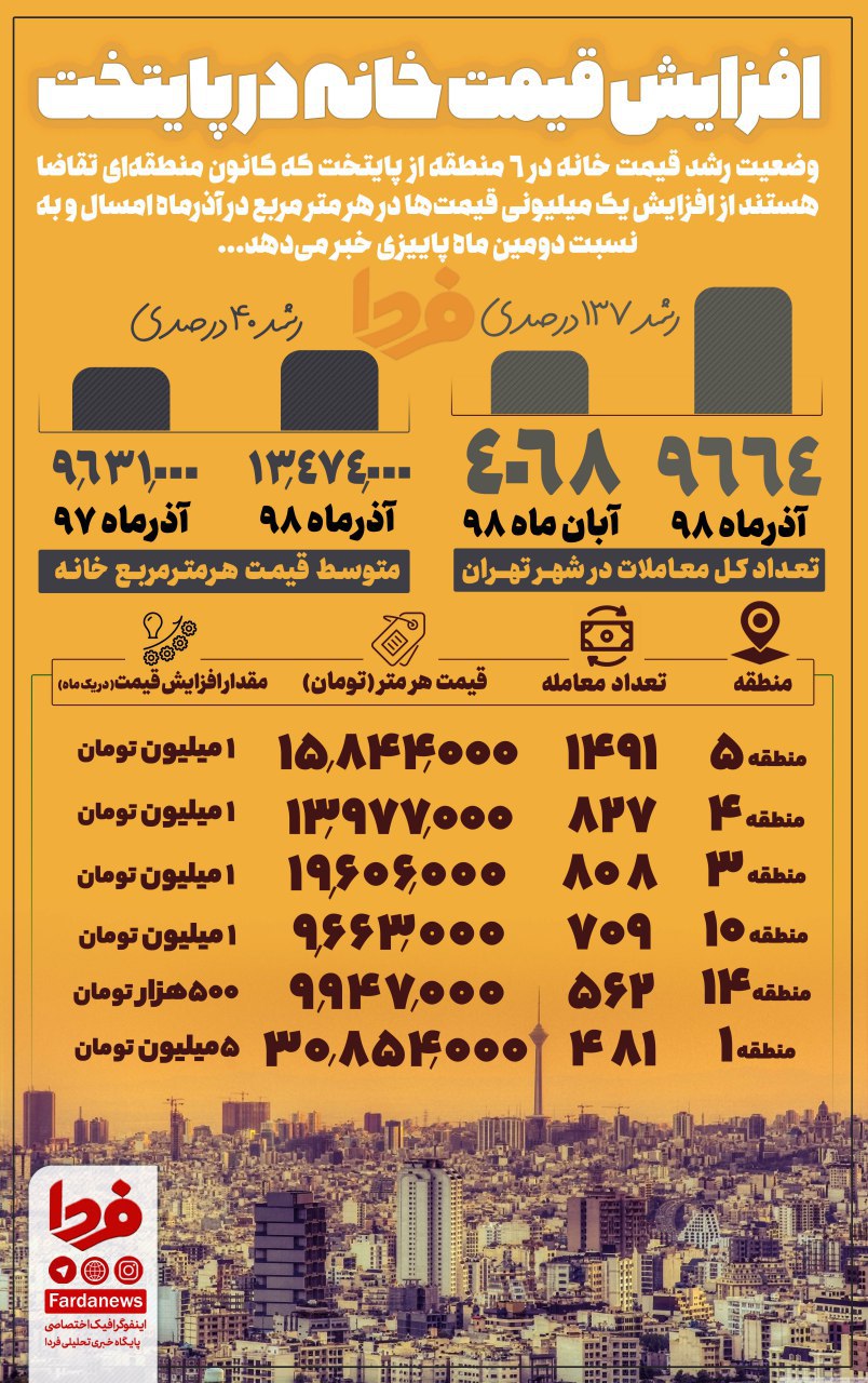 همچنین، متوسط قیمت هرمترمربع خانه نیز در آذرماه ۱۳ میلیون و ۴۷۴ هزار تومان است که در مقایسه با مدت مشابه سال قبل با متوسط قیمت ۹ میلیون و ۶۳۱ هزار تومان، نزدیک به ۴۰ درصد افزایش و نسبت به ماه قبل با متوسط قیمت ۱۲ میلیون و ۶۱۷ هزار تومان، ۶.۸ درصد افزایش را نشان می‌دهد.