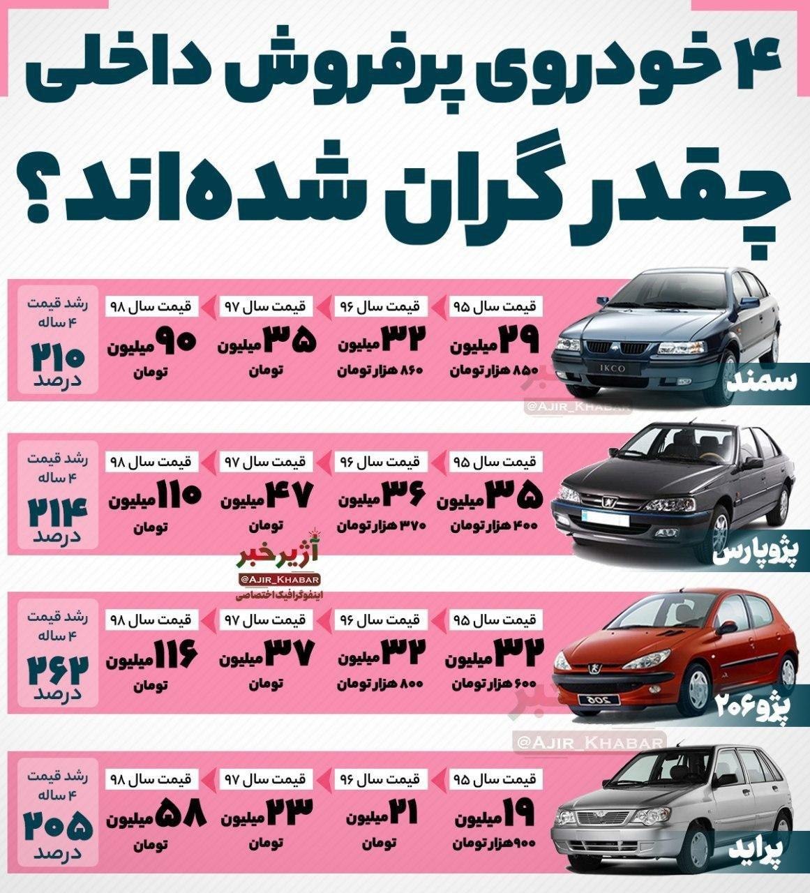 قیمت ۴ خودروی پرفروش داخلی بین سالهای ۹۵ تا ۹۸ بیش از ۲۰۰ درصد افزایش یافته است.