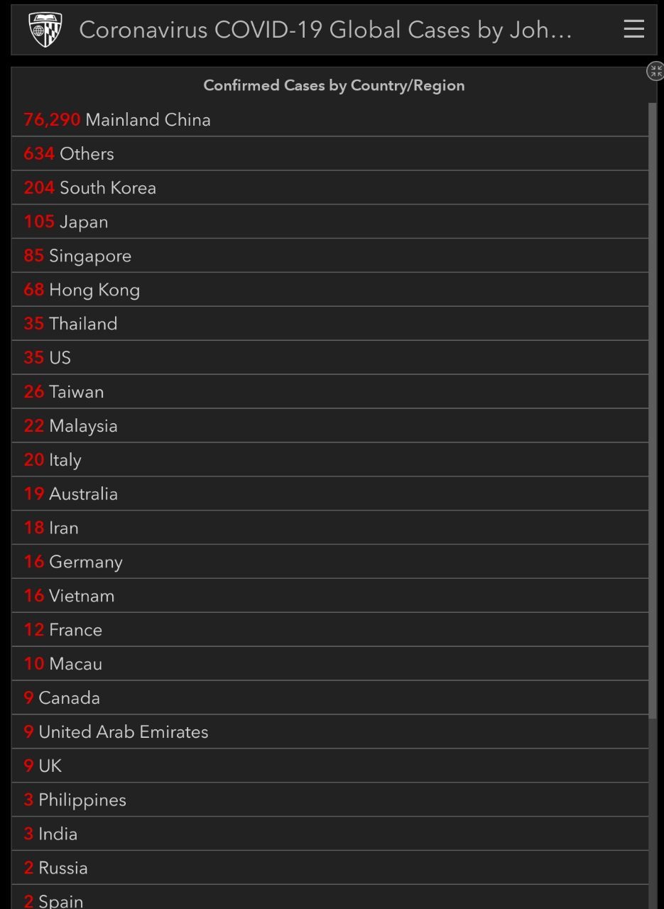 دولت چین گزارش داد که تعداد فوتیها در این کشور تا پایان روز جمعه به ۲۳۴۵ نفر رسیده است. تعداد مبتلایان در چین، کره، ژاپن و سنگاپور بیش از سایر کشورها است.
