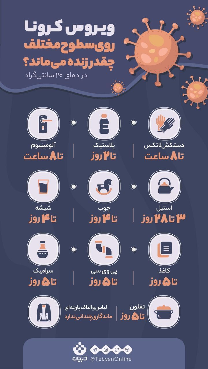 اینفوگرافی| ویروس كرونا روی سطوح مختلف چقدر زنده می ماند؟