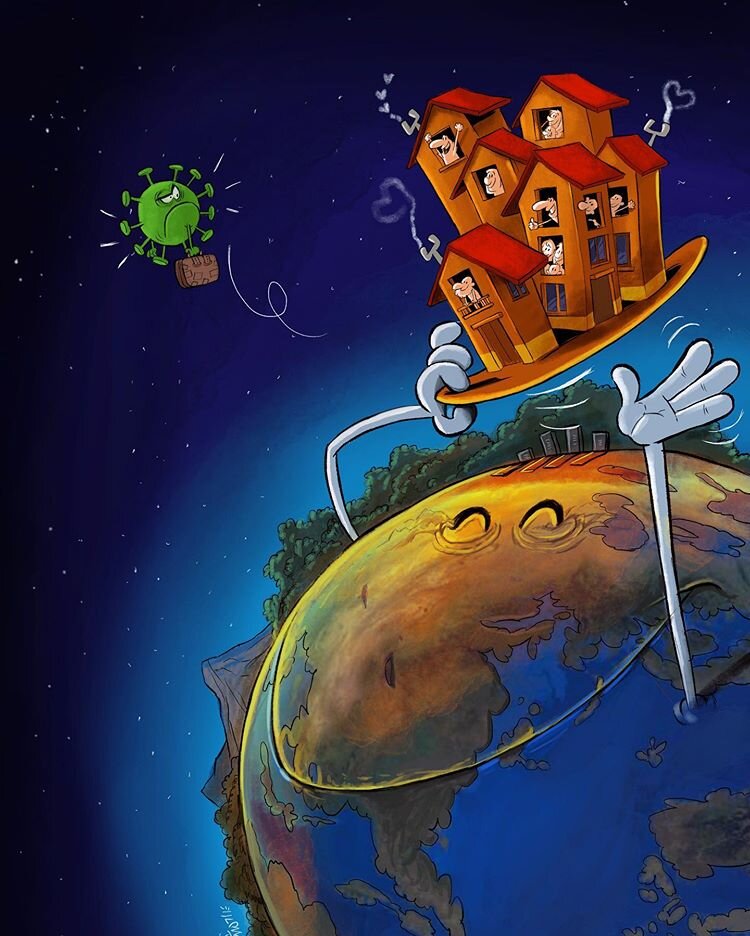 علی رادمند با انتشار کارتونی در صفحه اینستاگرامی خود با موضوع لزوم قرنطینه خانگی نوشت: در خانه بمانید تا زمین دوباره لبخند بزند.