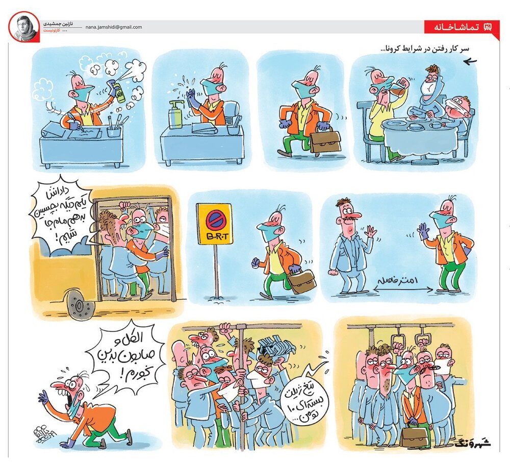 نازنین جمشیدی با انتشار کارتونی در صفحه طنز و کارتون شهرونگ به عدم رعایت فاصلهگذاری اجتماعی در ناوگان حملونقل عمومی پرداخت.