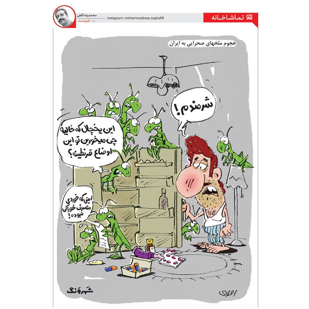 با گذشت ۲ ماه پس از ورود ملخها به کشور، موج جدید این آفت بار دیگر زندگی در برخی استانهای جنوبی کشور را با مشکلاتی روبهرو کرده است. محمدرضا ثقفی با انتشار کارتونی در صفحه طنز و کارتون شهرونگ به این موضوع پرداخت.