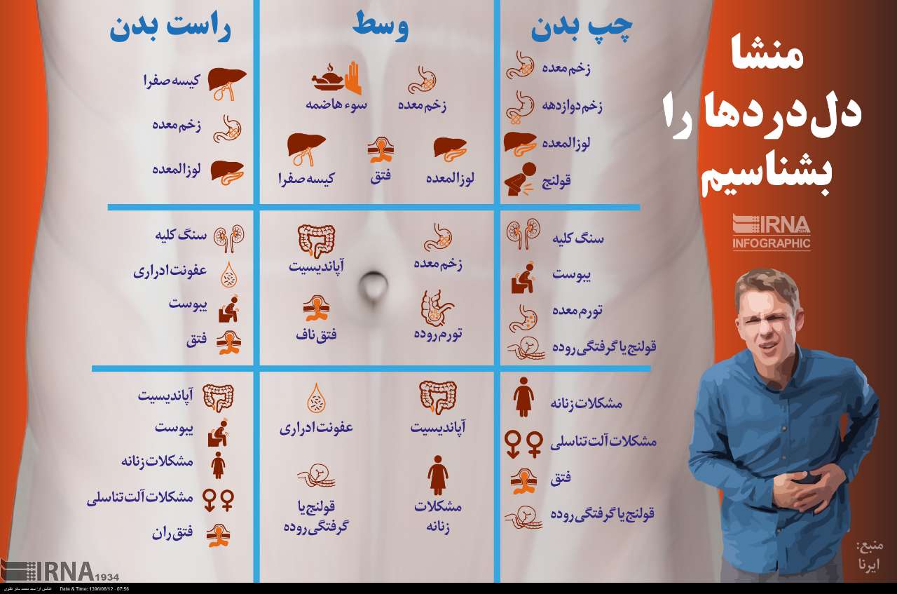 در اینفوگرافی زیر بیماری هایی که باعث دل درد در سمت راست،وسط و سمت چپ شکم است را به شما معرفی می کنیم.