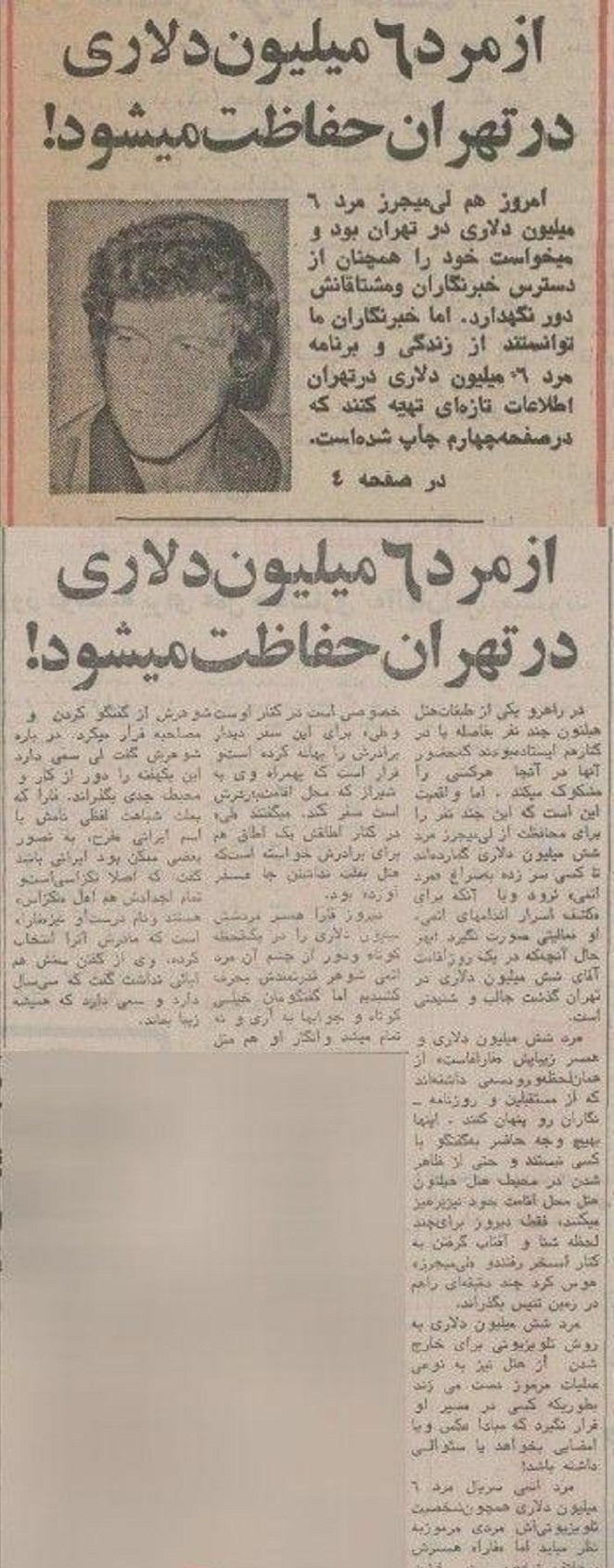 امروز هم «لی میجرز» مرد ۶میلیون دلاری در تهران بود و می خواست خود را همچنان از دسترس خبرنگاران و مشتاقانش دور نگهدارد، اما خبرنگاران توانستند از زندگی و برنامه او اطلاعات تازه‌ای تهیه کنند.