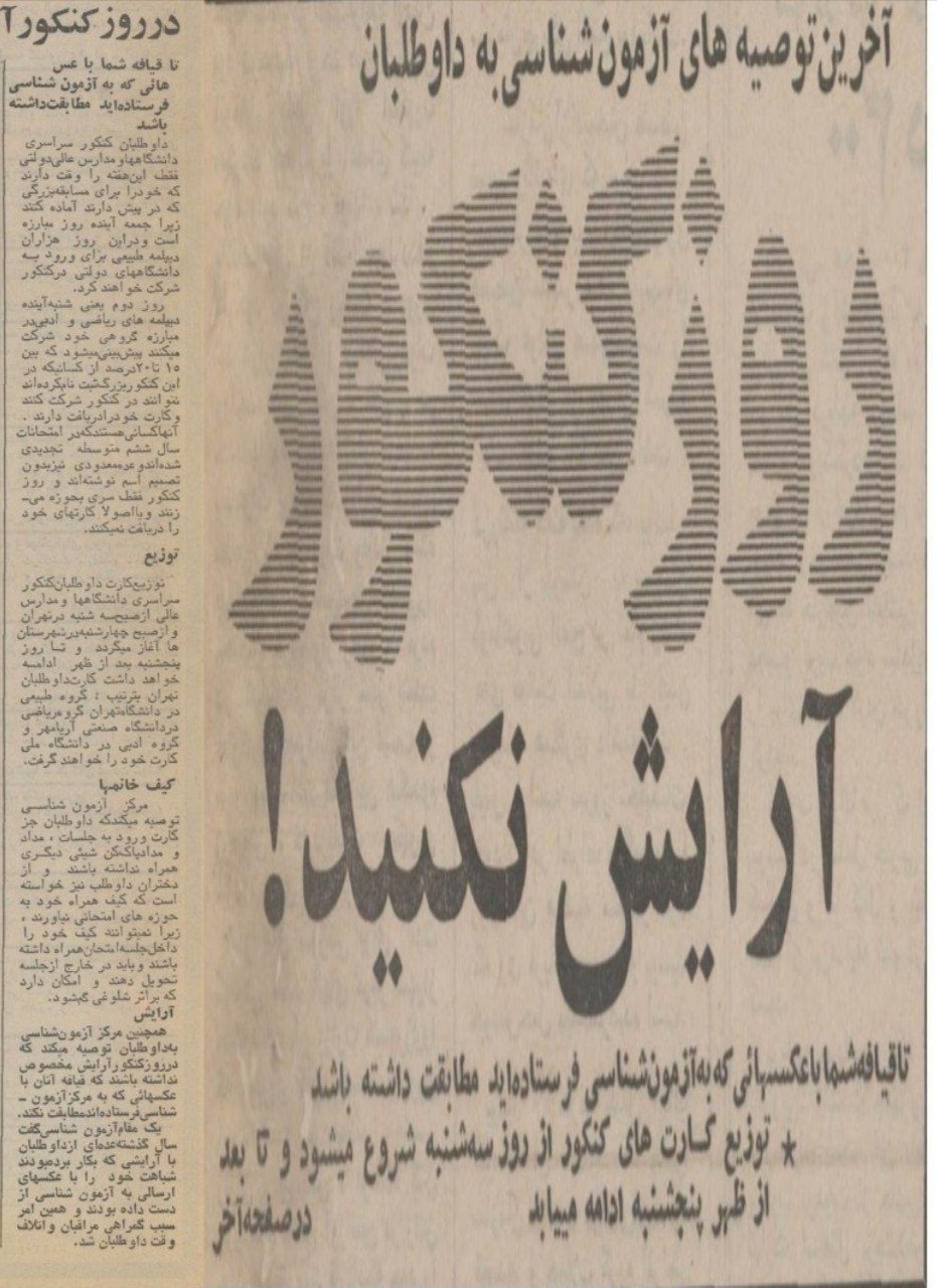 روایت روزنامه «اطلاعات» از توصیه آزمونشناسان مبنی بر آرایش نکردن در روز کنکور در ۹ تیر ۱۳۵۲ را در این گزارش بخوانید.