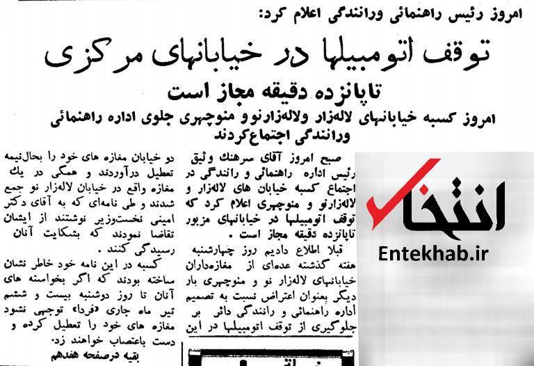 روایت روزنامه «اطلاعات» از نقل قول رئیس اداره راهنمایی و رانندگی مبنی توقف اتومبیل ها در خیابان های اصلی فقط به مدت ۱۵ دقیقه در ۲۵ تیر ۱۳۴۰ را در این گزارش بخوانید.