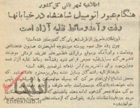 اطلاعیه شهربانی کل کشور: هنگام عبور اتومبیل شاهنشاه در خیابان‌ها، رفت و آمد وسایل نقلیه آزاد است.
