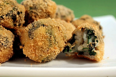 درون کاسه ای متوسط، سیب زمینی و اسفناج را با هم مخلوط کرده، نمک و فلفل را به آن اضافه کنید سپس با دست از مخلوط به اندازه یک لقمه، یک لقمه برداشته و آن ها را به شکل توپ درآورده سپس درون مخلوط پودر سوخاری و نمک بغلطانید.